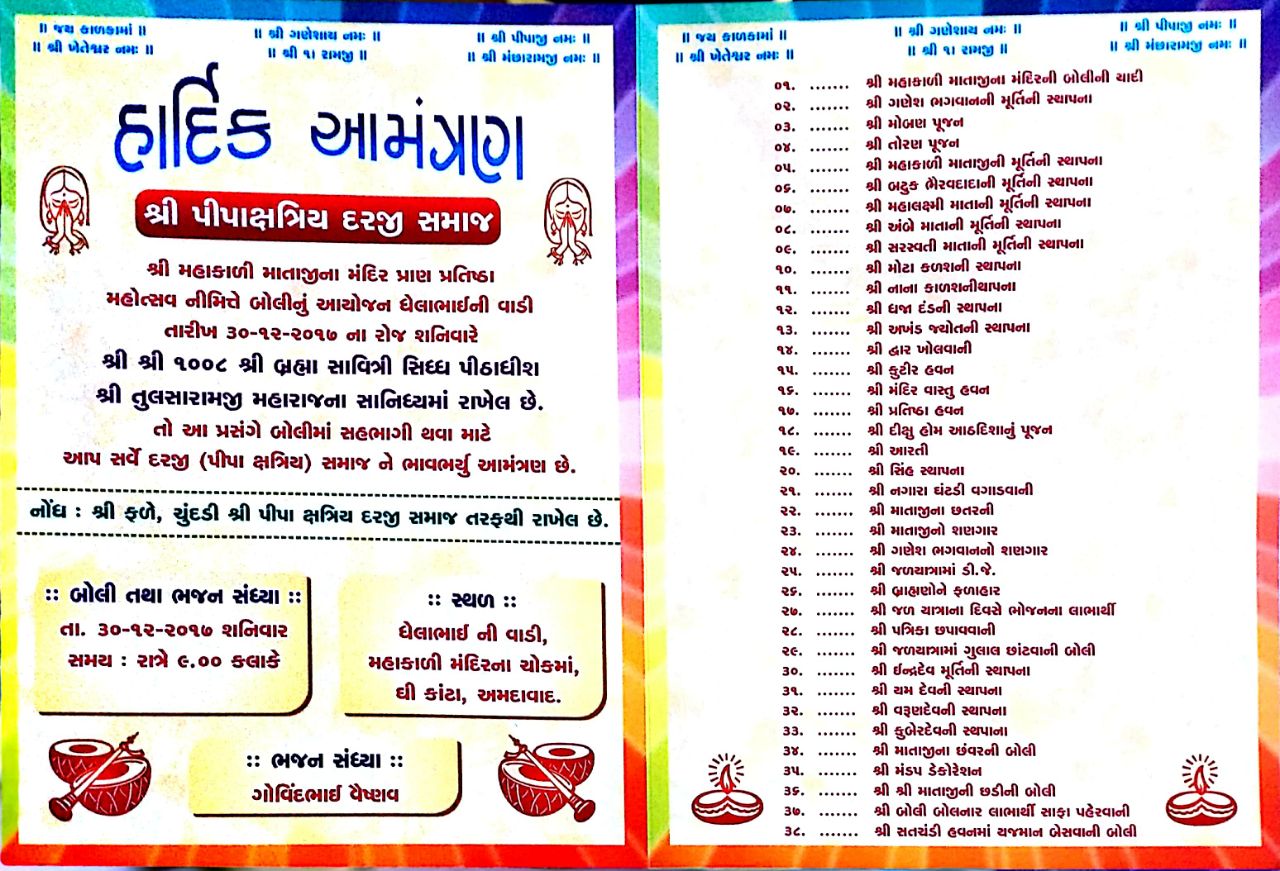 श्री पीपा क्षत्रिय दर्जी समाज श्री महाकाली माताजी मंदिर प्राण प्रतिष्ठा महोतष्व निमित बोली का आयोजन घेलाभाई की वाड़ी दिनांक- 30-12-2017 शनिवार को रखा गया है। जिसमे सभी समाज बन्धु ( पीपा क्षत्रिय ) सादर आमंत्रित है ।।