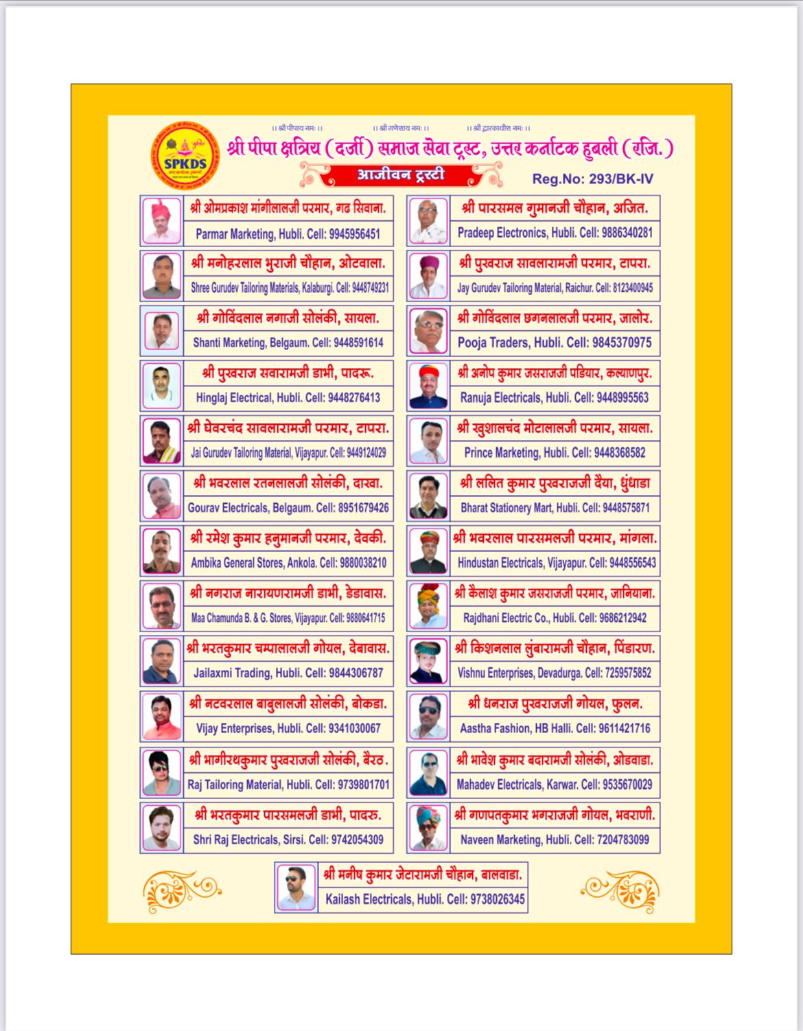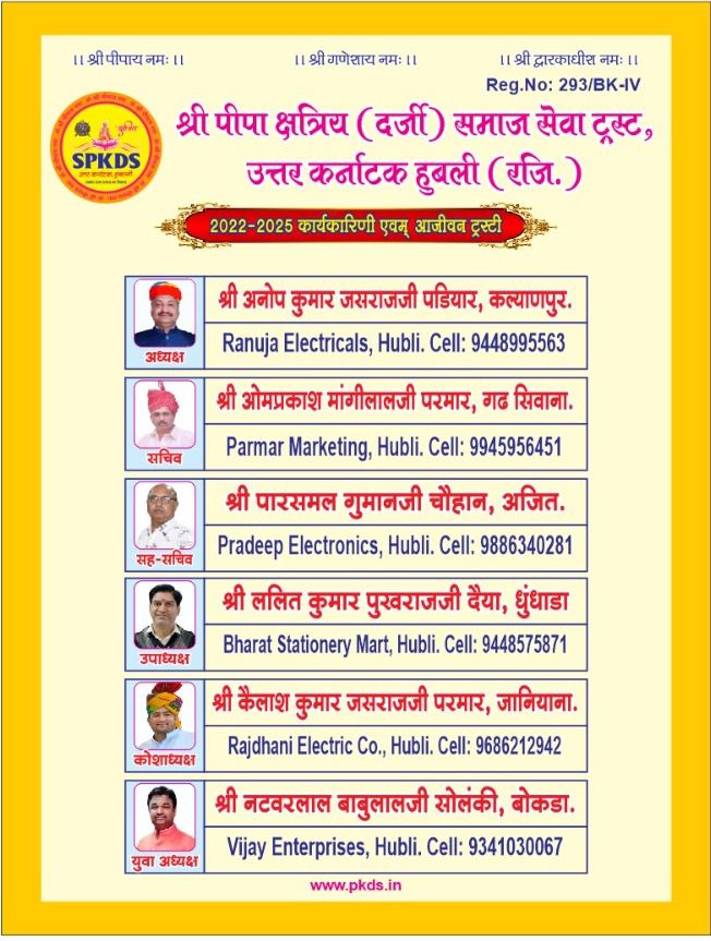 श्री पीपा क्षत्रिय दर्जी समाज सेवा ट्रस्ट उत्तर कर्नाटक हुबली में समाज की जगह लेने हेतु इस ट्रस्ट का गठन करके रजिस्टर्ड कराया गया जिसमे आजीवन सदस्य बनाये गए एवं कार्यकारिणी का गठन किया गया लिस्ट इस प्रकार है आजीवन ट्रस्टी लिस्ट